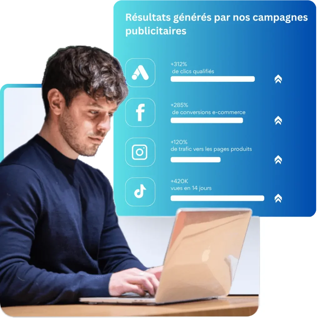 On sélectionne les plateformes les plus performantes (Google, Meta, TikTok, etc.) et on structure vos campagnes selon vos priorités : notoriété, trafic, leads ou conversions. Chaque structure est pensée pour être scalable et pilotable.