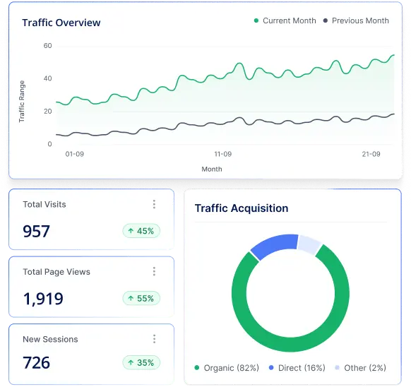 Rapport mensuel avec vos KPIs clés : positions, trafic organique, taux de clics, leads générés. Nous ajustons la stratégie en continu selon les résultats et les évolutions de l’algorithme Google.